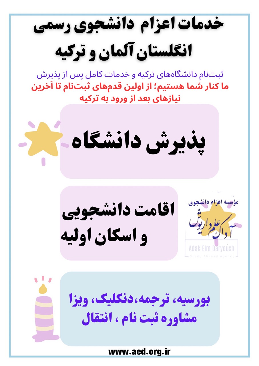 مؤسسه آداک علم داریوش با ارائه خدمات حرفهای و تخصصی در زمینه اعزام دانشجو، دارای مجوز رسمی از وزارت علوم، تحقیقات و فناوری جمهوری اسلامی ایران میباشد. ما با بهرهگیری از دانش تخصصی، تجربه عملی و تیمی مجرب، در تمام مراحل مشاوره، انتخاب رشته، اخذ پذیرش و پشتیبانی مهاجرت تحصیلی همراه شما هستیم. ارتباط مستقیم و گسترده ما با دانشگاههای معتبر خارج از کشور، به ویژه در ترکیه، آلمان و انگلستان، این امکان را فراهم کرده است تا پذیرش تحصیلی متقاضیان را در کوتاهترین زمان و با بهترین شرایط به انجام برسانیم. با آداک علم داریوش، آینده تحصیلی خود را با اطمینان و آگاهی بسازید.